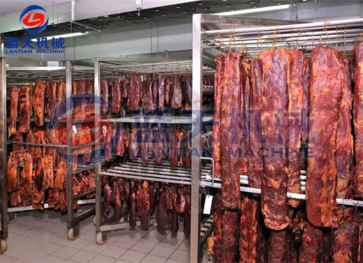 歷時(shí)5到6個(gè)小時(shí),在物料裝入烘干房后兩小時(shí)內(nèi),溫度快速升到60到65度,此時(shí)不用排濕。這一過(guò)程主要是起到一個(gè)發(fā)酵的過(guò)程,控制肉不變色變味。這就是我們通常說(shuō)的預(yù)熱階段。預(yù)熱時(shí)間后,調(diào)節(jié)溫度到45到50度,濕度控制在50%到55%的范圍之內(nèi)。
