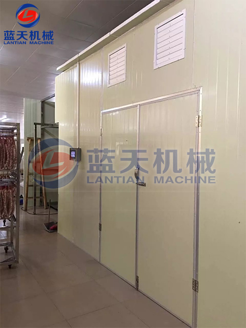 烘房設有燃煤管式熱風爐,以對流換熱方式使臘味脫水干燥。用此種方法干燥臘味,缺點明顯:產品受煤灰、煙灰污染,干燥周期長(一般要72小時左右),能耗大,臘肉需經過多次“轉竹”和“升柜”,勞動強度大,干燥過程的溫、濕度難以控制,臘味質量不穩定等。