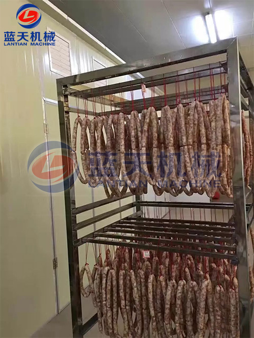 2、減速干燥階段。發色期和收縮定型期的控制,溫度控制在52℃~54℃,濕度控制在45%左右、時間為3到4個小時,臘腸逐漸從淺紅色轉為鮮紅色,腸衣開始收縮,這時一定要注意硬殼的出現,可以進行冷熱交替使用,效果更好。