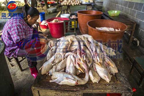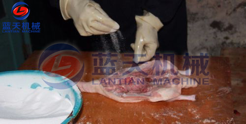 鴨只屠殺之前應予12~24小時絕食,并給以充分清水,使之安靜休息。如此可使屠殺放血良好,并可減少未完全消化的飼料污染屠體的機會。經(jīng)屠殺后,將屠體外表洗凈,祛除余毛,并應即速冷卻。鴨之屠體選用無骨折及瘀血斑點者,并將鴨只在肘關節(jié)及跗關節(jié)下端分別將兩翅及兩腳去掉。以左手抓住鴨之下額骨,右手持刀從口腔割掉帶舌的下額部,此處理俗稱割外五件。