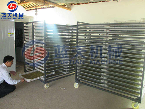 3.為了保證金銀花快速干燥和烘干質量,烘房內要做靜壓腔,讓出風更加均衡,回風設計在烘房頂部正中,讓熱風流動更加均勻順暢。