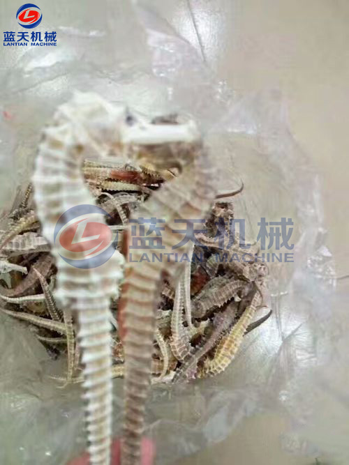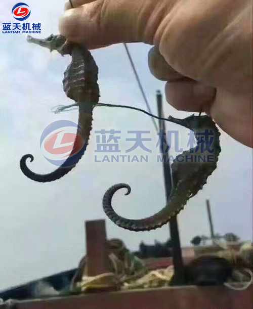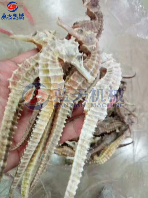 加工時(shí).將海馬放在淡水中,清洗干凈,浸泡一段時(shí)間后,洗刷去體表灰黑色的皮膜,剖腹去掉內(nèi)臟,將尾盤卷起,將處理后的海馬平鋪在物料網(wǎng)格盤中,插入物料推車隔層,將裝滿新鮮海馬的物料車推入烘干房,關(guān)閉烘干房密封門。