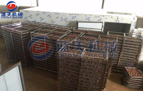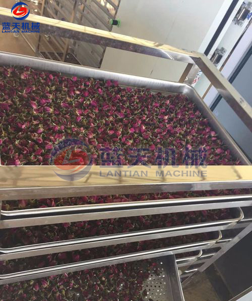裝滿花蕾的物料車要輕輕推入烘干房,關閉烘干房室門升溫,嚴格控制室內溫度、依次順序溫度慢慢提升,采用循環風路,確?;ɡ俑蓾窬鶆?,色澤鮮艷。