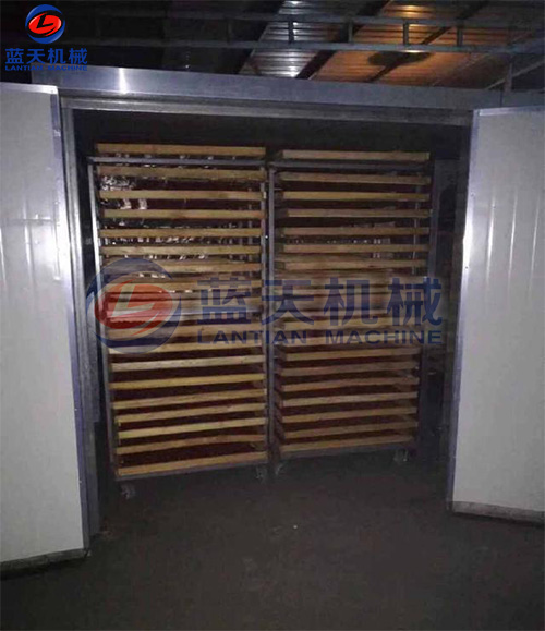 踩堆發汗:即將含水率75%一85%的辣椒,第一次將辣椒烘干到含水率50%踩堆發汗,再進行第二次烘干。踩堆發汗在辣椒干燥工藝中是一個很重要的步驟,是否采用這一步驟對辣椒品質和烘干時間、都有很大影響。辣椒在烘干過程中都有明顯的軟化和膨脹現象。踩堆發汗的主要作用是調質,使辣椒油向表面滲透,烘干后的辣椒顏色一致,紅潤光滑,并促使辣椒含水率趨于平衡。如不進行踩堆發汗,烘干1000公斤辣椒,熱風溫度40℃—60℃時 需時間63小時,踩堆發汗后則可縮短到40小時左右,且花黃殼顯著減少。