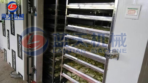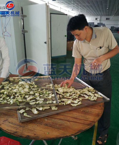 將切片好的佛手片放置于物料車托盤,注意堆放厚度不要超過3CM,這樣有助于烘房內(nèi)平流風(fēng)對(duì)整個(gè)物料的烘干效果保持一致性。