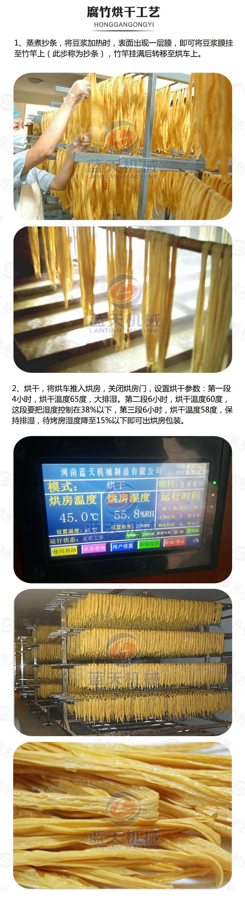 3:腐竹烘干一般經歷預熱50-60℃、高溫烘干大量排濕階段65℃,、恒溫烘干階段60℃,相對濕度控制在50%以下,待水分降至15%左右,降溫階段,烘干時間約5小時,含水量約8%左右即可。這樣腐竹烘干機烘干的腐竹品質好,表面的油份和光澤度適當,不易脆斷,保留了成品的色、香、味、形,且腐竹的損耗小。