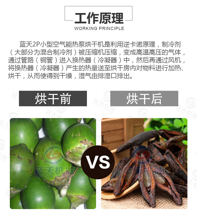 1、采用熱泵檳榔烘干機對檳榔進行烘干處理,烘干過程能耗低,有效減少運行成本。