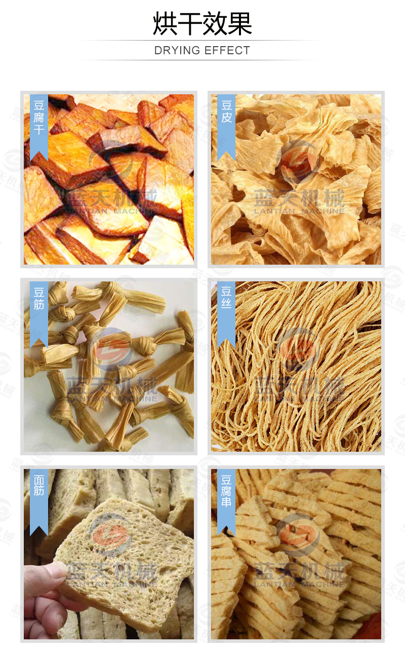豆腐干坯要平鋪,片塊間保留適當的間隔,不能重疊,否則會造成花片或壓痕。豆腐干烘干時,豆腐干烘干設備應先中溫、再低溫,一般不用高溫。一般豆腐干烘干機宜采用的溫度為85℃左右,不超過95℃。豆腐干烘干設備溫度太低,效率低且易使產品變質;溫度太高,容易引起豆干坯內部水分迅速汽化而沖破豆干坯表面,造成不均勻甚至表面破損狀態,形成感官缺陷。如果要使烘干后豆腐干形成特別耐咀嚼的感覺,豆腐干烘干機則應采用低溫長時間的方法。豆腐干烘干時間根據豆腐干設計的軟硬度及休閑豆干坯厚薄決定。
