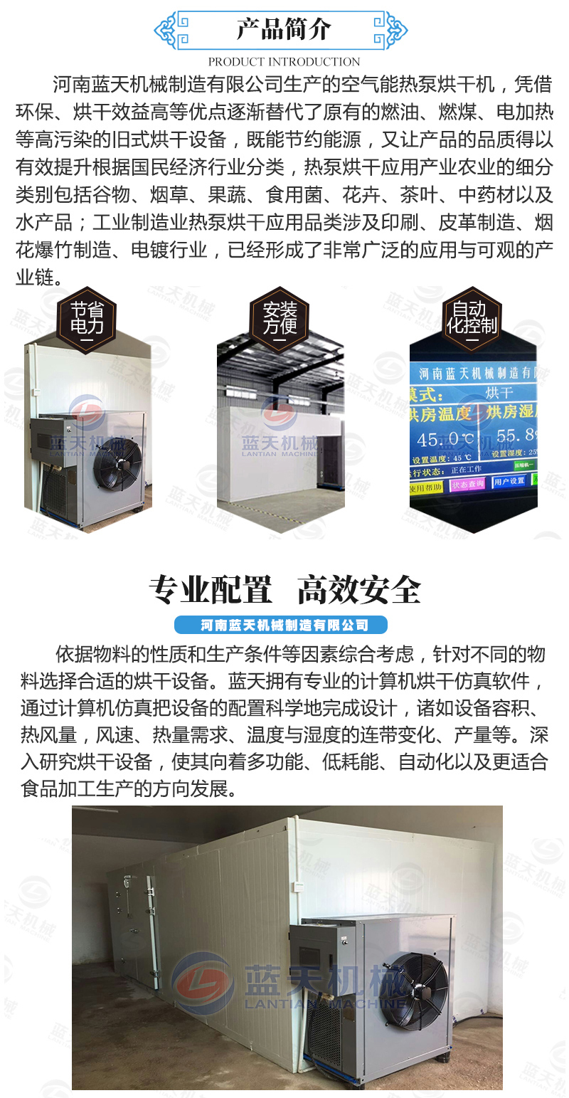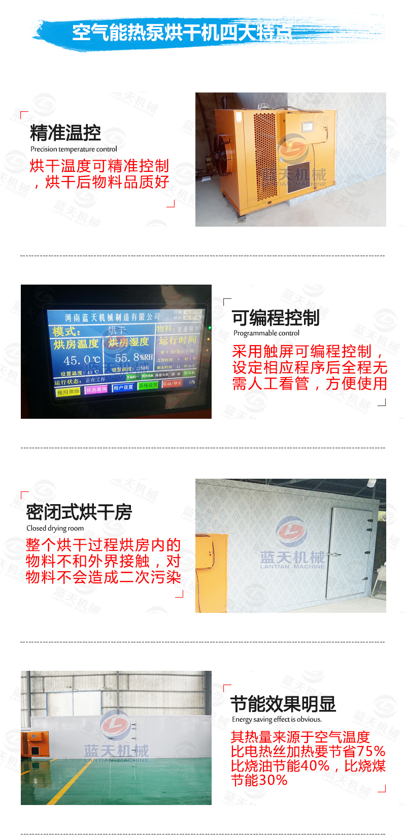 空氣能熱泵烘干設備有哪些功能?標配的功能有烘干、除濕、排濕、冷干、四效熱回收、觸摸屏控制、可編程(分10個時段)