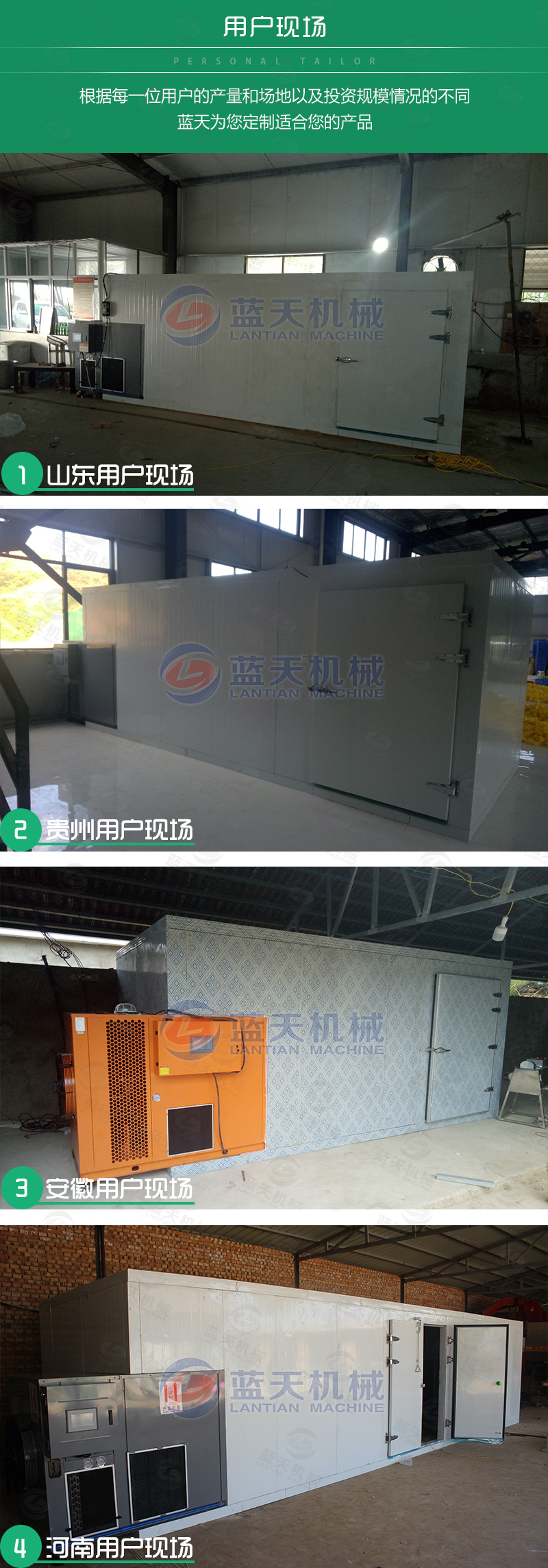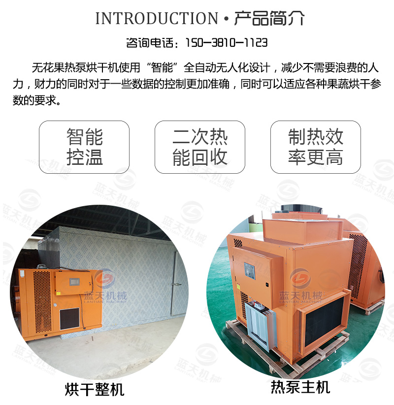 無花果鮮果含水以游離水、膠體水及化合水狀態存在,含水率達75-80%,含糖高,如果自然曬干時太陽光強度不夠,很難把無花是干透,使用空氣能無花果烘干機在于溫度、濕度、風速、風量可控。視塊狀大小一般初期1小時無花果烘干設備設置溫度宜在70-85℃的范圍,在短期內使無花果水分大量的蒸發,這4小時的排濕控制在50%,二段8小時的時間,溫度以60-70℃的范圍為基準,稍縮短排濕時間,濕度控制為30%,三段5小時的時間,溫度降低50-60℃,濕度繼續降低至10%;整個過程約18小時,無花果含水率降到15%以內。如為整顆烘干,需要的時間更長一些,先將果子均勻的鋪放在架子車上,推入烘干房干燥25-30小時后,再推出烘房外陰涼的地方放置24小時,再推入烘房內進行第二次的烘干。無花果烘干機24小時的烘干量視機型規格決定,少的以600-800斤一個批次,多的2000斤一個批次,10000斤甚至更大產能則考慮對吹及組合方式即可。這里提到產量,朋友們就會知道無花果烘干機的機型是有不同型號的,那無花果烘干機價格就是因型號不同而異了,這個需要了解客戶您的具體需求。