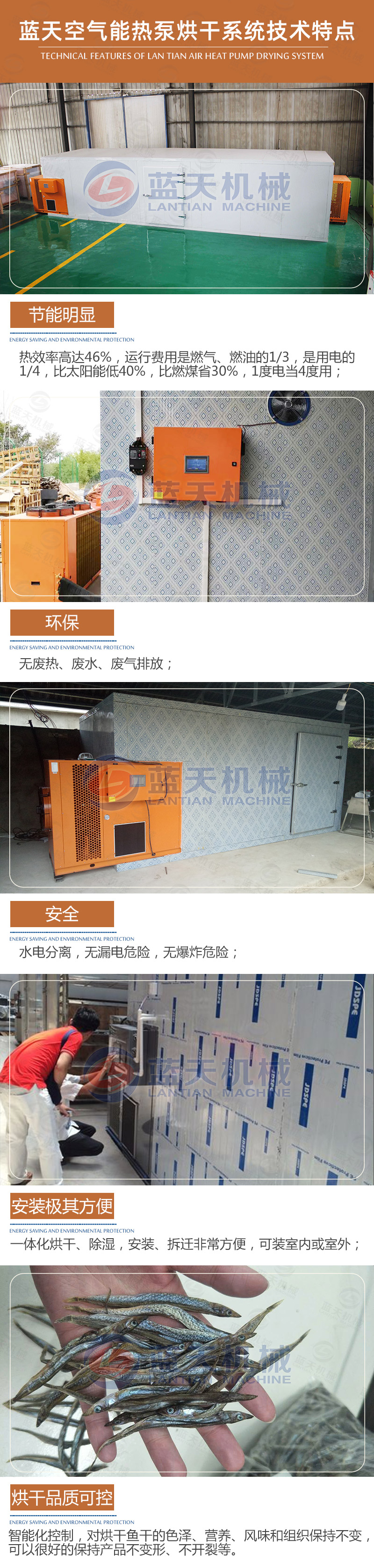 魚干的種類很多,將新鮮魚類經烘曬干制而成。海魚、淡水魚都可以制成魚干。脫脂魚干是以好的鮮魚為原料,經過高溫蒸煮、烘干等程序精制而成,各項指標均達到規定的標準。海魚相比淡水魚由于體積較小以及溫度要求可調范圍更大,所以海魚烘干質量優先。除了傳統工藝,太陽曬干,就是市面上烘干設備種類較多,每種烘干設備都沒有一個標準,烘烤出來的魚干色澤和營養成分也參差不齊,如果采用煤鍋爐或者油鍋爐以及燒柴設備烘干,對于食品來說,很不衛生,所以一直不能得以應用。為解決魚干烘干上存在的各種問題,空氣源熱泵魚干烘干機就出來了。