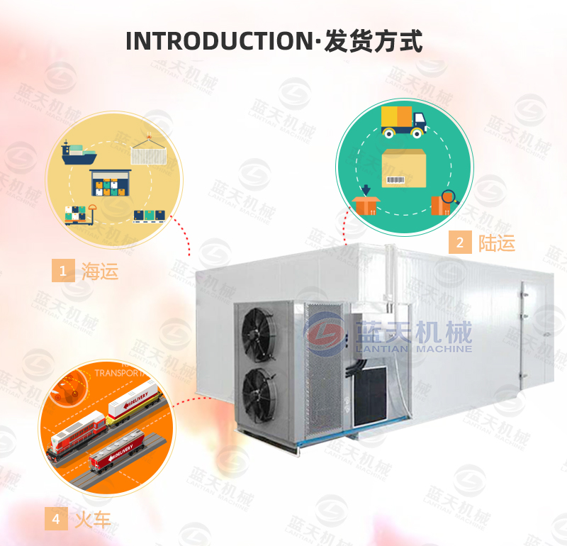 剝好的龍眼肉上托盤鋪好,保持好均勻的鋪放密度與托盤間距。托盤可采用不銹鋼車架與竹托盤的形式。在進入空氣能箱式龍眼烘干機設備前,根據空氣能龍眼烘干機智能PLC屏幕的提示,選好烘干除濕的模式,設置好溫度、濕度、風速等數據,進行分段控制。