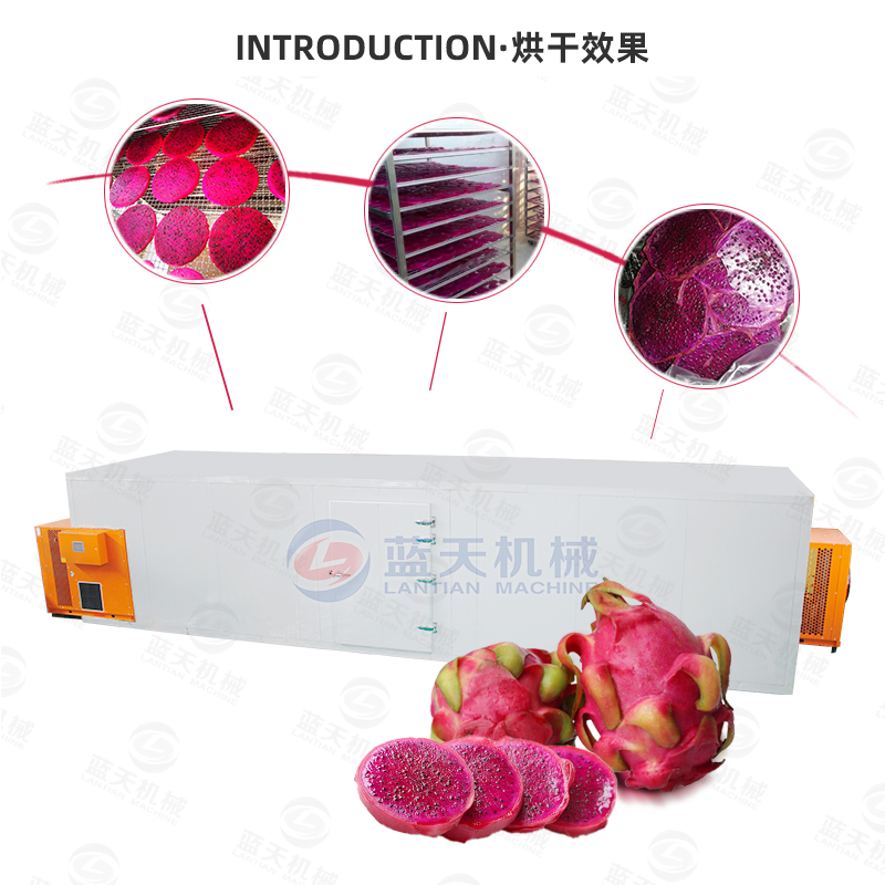 5、使用火龍果烘干機進行烘烤,將浸糖后的火龍果片裝盤,放上物料車,推進火龍果烘干設備內,烘至果片表面糖漿不再粘滯為合適。